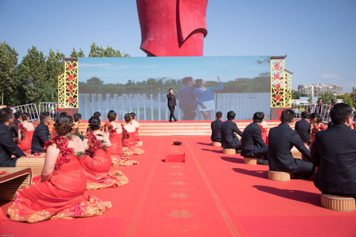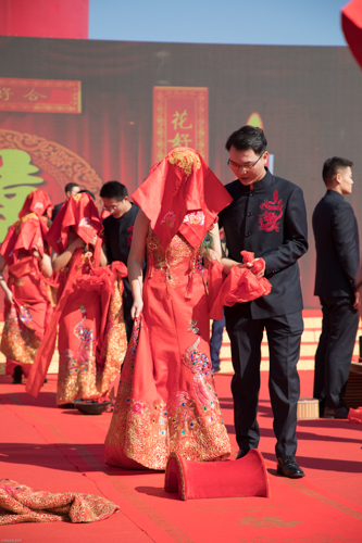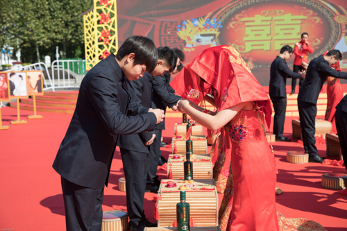 仪式盛大而不铺张。。在中式婚礼司仪的指导下,,20对新人身着古板制服步入现场,,依次举行迈火盆、跨马鞍、三叩九拜、挑盖头、结发礼、合卺酒、执手礼等环节,,尽显古板婚礼仪式的庄重高雅,,感受中华民族古板婚俗文化。。著名歌手海来阿木来到现场,,为新人们送上甜蜜歌曲和优美祝福。。同时,,安徽果博官网集团还为新人们准备了旅游券和果博官网洞藏酒券等贺礼。。