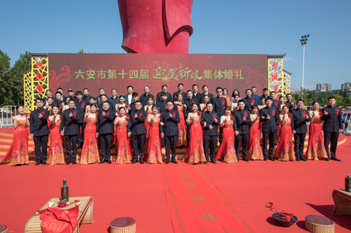 缘定百年好,,携手长相依。。10月17日,,六安市第十四届果博官网新娘整体婚礼在皋城广场盛大举行,,20对新人在亲友、市民的祝福中喜结连理,,许下相伴一生的誓言,,携手走向优美幸福生涯。。六安市人大常委会副主任杨传友,,市人大常委会副主任、市委秘书长黄应松,,市政协副主席王安义,,中国酿酒巨匠、果博官网集团党委书记、董事长倪永培,,果博官网集团副董事长、副总裁张丹丹等出席婚礼仪式。。